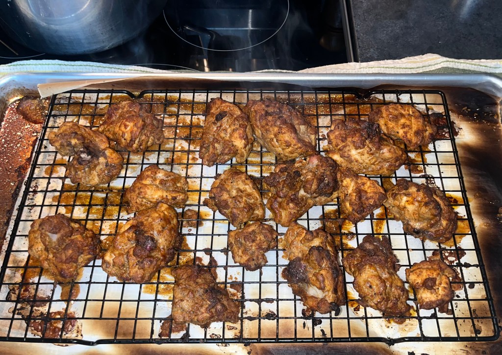 I spread the chicken out on a wire tray and put it into the oven under the broiler for 7 minutes a