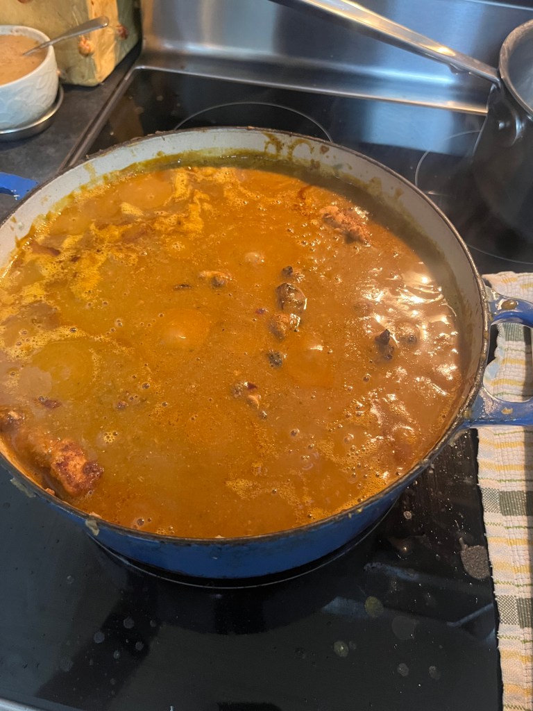 I slice the onions with a mandoline, then saute them with olive oil making sure they don’t turn too dark, or it will be too bitter. While they are cooking, I skin the ginger and the garlic and drop it into a food processor with up to a cup of chicken broth to get a real paste texture. Once the onions are ready, and cool enough to handle, they go into the food processor as well. When the onion, garlic, ginger paste is smooth, I add some oil to a Dutch oven, and when its good and hot I drop the paste into the pot. While that is cooking I chop the peppers, the sorrano into rounds. I deseed the jalapeno and habanero, and drop them in too. When they are all softened and the paste has stopped sizzling, in goes the reserved stock from the turkey soup and the tiki masala paste and simmer sauce. I add any chicken stock needed to make it liquid, bring it to a boil, then turn it down to a medium simmer and leave it partially covered while I attend to the next steps.