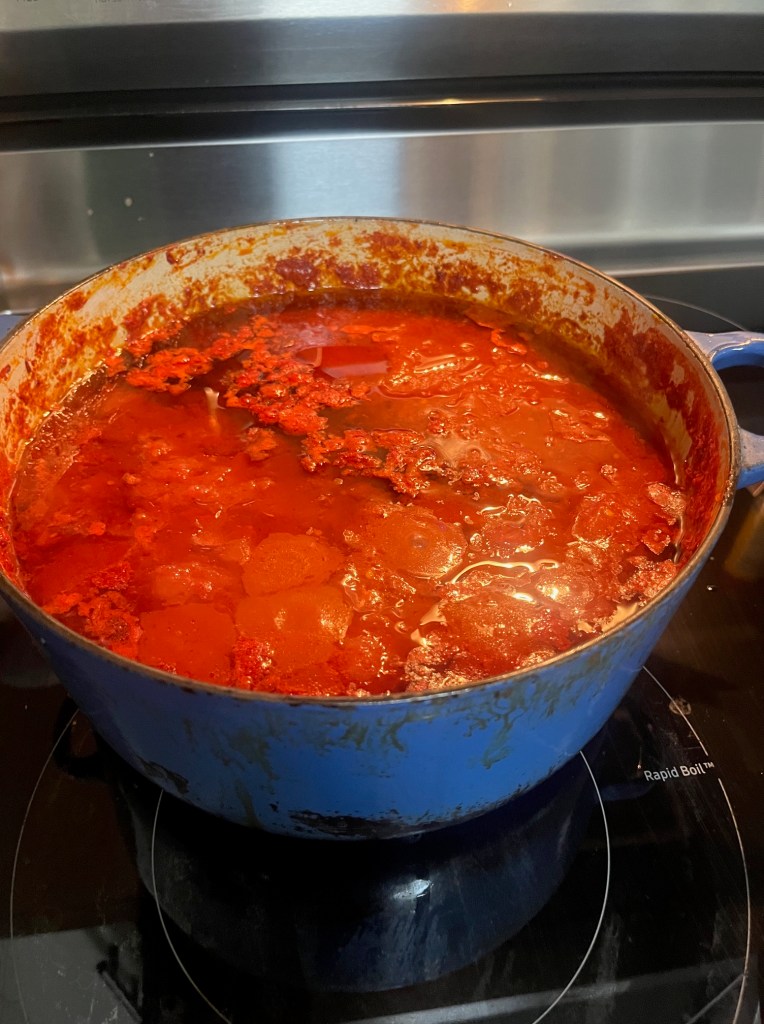 - When the garlic is just about done, add the red pepper flakes and let them roast for no more than a minute so that their flavor infuses into the garlic. Then add the tomatoes, and the salt. Give it a good stir, then turn the heat up so that it comes to a gentle simmer. Allow it to simmer for 4 hours, mothering it a little bit.