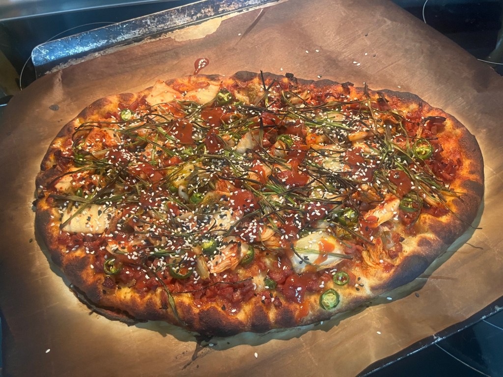The next pie we chose to make was the Lady Zaza, created by Ann Kim and served in her restaurant in Minneapolis. We are blessed to have access to SE Asian foods here in the PNW, so sourcing the ingredients was easy. This is a Korean spicy sausage pizza with Kimchi and a couple of other hot ingredients. It has serrano peppers, a hot kimchi, sesame oil, gochujang and a blistering hot Korean Chili Sauce, tomato sauce as well as scallions and both white and black sesame seeds to finish. It is without a doubt, one of the most delicious pizzas I have ever tasted. It is the definition of moreish. Both Heather and I said that even though it was so hot, we could not stop eating it, and, because we now have a few of the ingredients, we will be making it again next week. The best words for a chef to hear are, “Put that in regular rotation!” This was one of those pizzas!