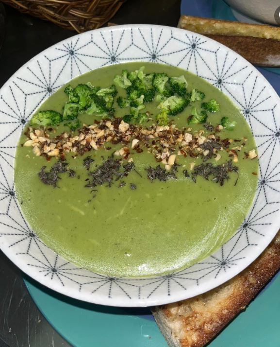 This is the Broccoli Gruyere Soup. When I found the soup in the Modernest Cuisine at Home cookbook, it seemed an easy cook. You pretty much use a pressure cooker. You put the floweretes from 3 broccoli stems into the pressure cooker with butter, backing soda and water, then blend it and pass it through a sieve, after that, you incorporate the cheese and add any broth needed to get the texture right. Finish it with roasted hazelnuts and fresh thyme and a few of the flowerets fried.