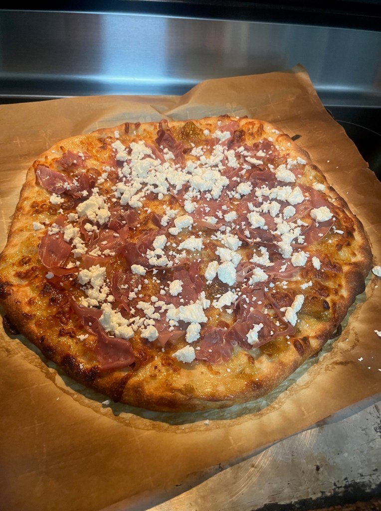 Our next effort took us in a totally different direction. Heather wanted to try the pizza she calls “Figgy PIggy Pie”. It’s a fig jam base with mozzarella, thin prosciutto, and finished with Feta. For me, its a tad too sweet, although the saltiness of the prosciutto carries it quite well. Next time we make it, we will add lemon juice to the fig jam to add the acidity I think it needs.