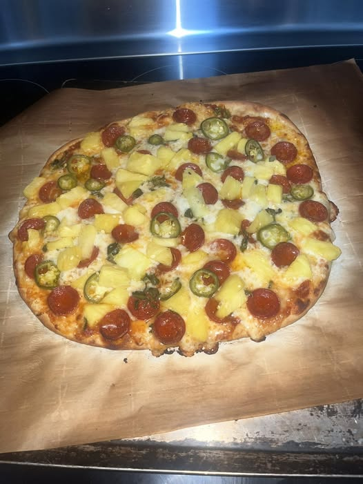 Next up we went back to the menu from PDX of Portland, a passion project of Chef Miriam, a NYC raised chef with good ideas. The pizza we chose to make was her Yum Yum Hawaiian which we modified by using a spicy tomato sauce, and peperoni (which we had in stock) rather than salami. We also used the jalapeno’s from the pineapple pickle and finished with hot honey. It was so delicious that we will make it again, but this time with Salami instead of peperoni.