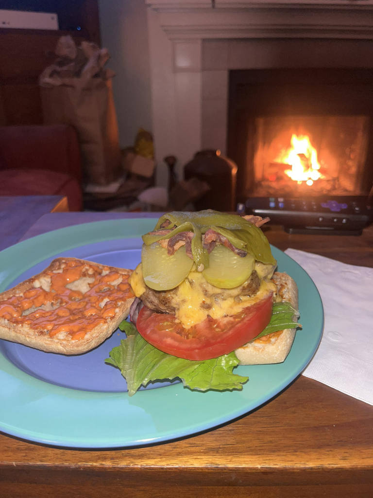 I salt and pepper the burger before it goes into a hot pan, and sear both sides till the inner temp is 130 or so, then the cheese goes on and into a hot oven it goes under the broiler. We toast the ciabatta buns, sauce them, put lettuce, tomato and pickles on the bun, add the burger, on top the roasted pepper and the bacon and we are in business! It’s a prety fucking good burger, even if I say so myself!