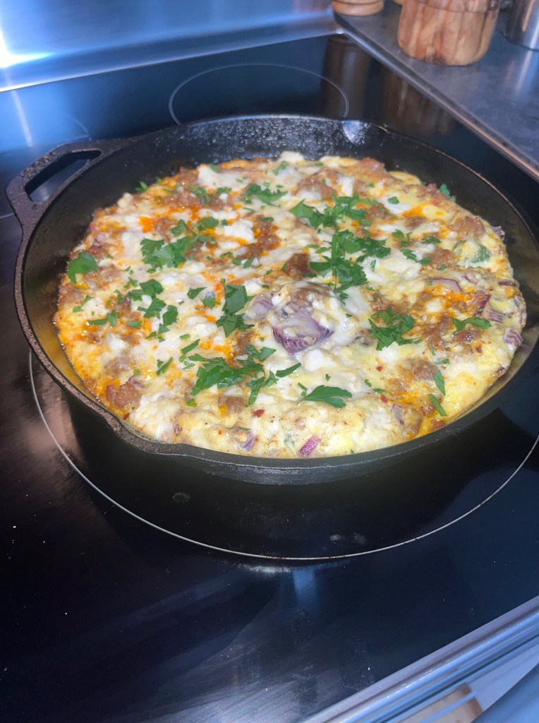 Nothing like a frittata on a Sunday morning in front of the fire watching footy. This was a “what in the fridge” sort of breakfast. I threw it all together and YUMMY! The secret is to spread the the ingredients evenly across the skillet carefully pour the custard (with the garlic and spices) over the vegies etc, then crumble fetta cheese over the top. Drop it in a 400 degree oven for 20 minutes and sprinkle chopped italian parsley over it before serving.