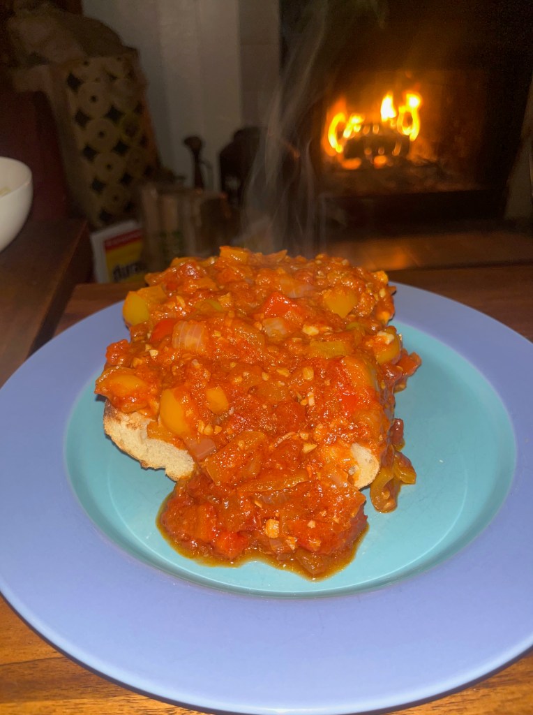 The sauce is actually very tasty. Using a chopped onion, loads of garlic, along with chopped red, orange and yellow bell peppers in a bath of crushed Italian tomatoes. Because we like it hot, I added a healthy pinch of red pepper flakes early in the process as the onions were sweating. We also had a couple of left over hot Italian sausages from our pizza the other day, so we picked up a French Baguette and made what we called “Italian sloppy Joes”. Super yummy. We toasted the bread, layered some sauce, and fontina cheese, then split the sausage and covered the lot in loads of the Peperonata sauce. It was super yummy!