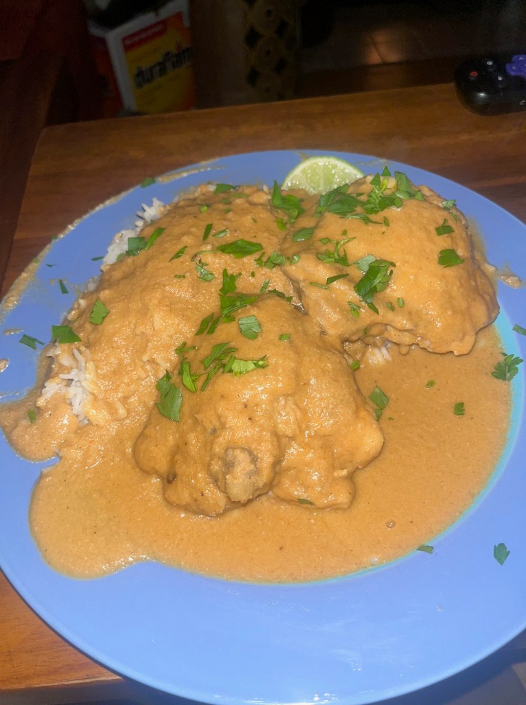 Gallina en Salsa de Cacahuete is rich, nutty, and savory dish from Equatorial Guinea. It’s pretty simple, but takes a while to do all the steps. First you make a chicken stock using the chicken pieces plus onion, garlic, bay leaves and spices (peri peri). After covering and simmering it for about 20 minutes in chicken stock, you set the chicken aside, then set about making the peanut sauce. Here you use tomatoes, onion, garlic, salt, cumin and chili’s (peri peri) and roasted peanuts that are ground up. Then using the chicken stock that was set aside, you bring the sauce up to a pourable consistency, drop the reserved chicken in and let it simmer together for about another 20 minutes. Serve it over coconut rice. I made the rice by rinsing basmati rice and soaking it for a half hour before bringing it to a boil in coconut milk, a little salt and a couple of bay leaves. Once it came to a boil, I turned it down and stirred it on a medium heat till the water in the coconut milk had largely evaporated, then I covered it off the heat and let it sit for about 20 minutes before fluffing it with a fork.