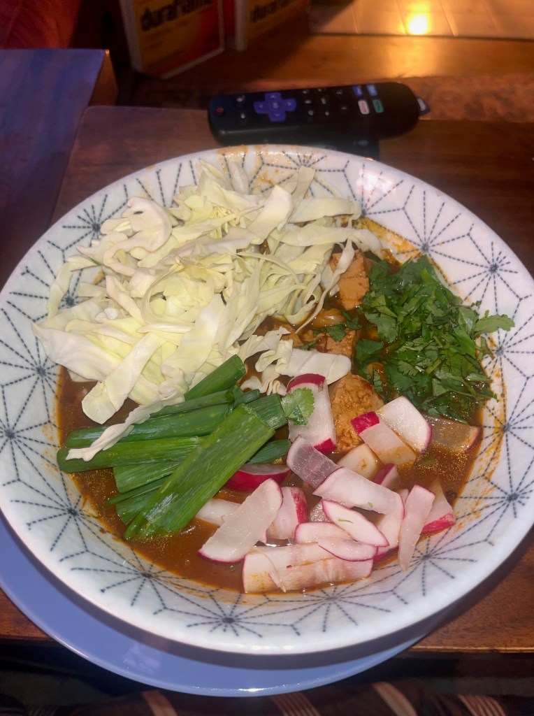 You start with chili, I used several, toast them, soak them and eventually blend them with garlic and cocoa powder. The meal begins with an onion and a pile of (pressed) firm tofu, the garlic chili paste and the water the chili soaked in, hominy, zucchini and broth along with salt, oregano and peri peri spice, all of which cooks down for about 30 minutes. Finished with a little maple syrup and the juice of a lime , its served with cabbage, radish green onion and cilantro. Absolutely delicious.