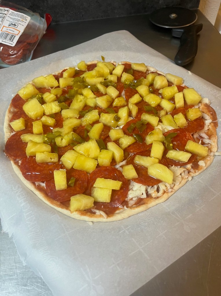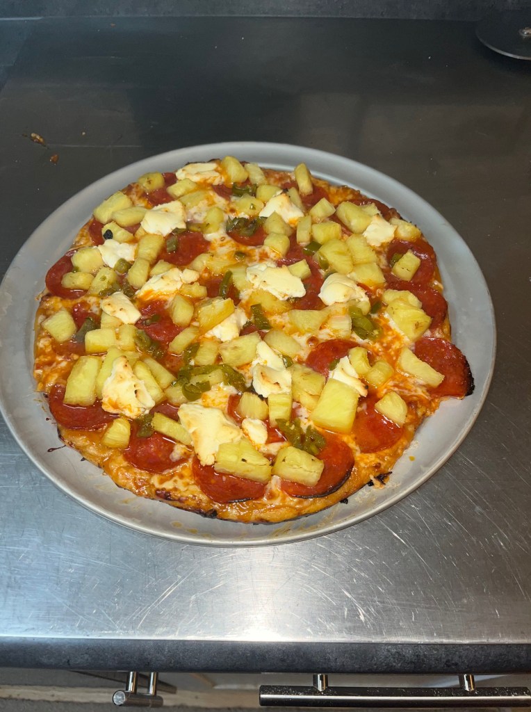 Is this a peperoni and pineapple pizza, or is it an Erie Ave pizza with pineapple? Well, sort of neither and both. I started out with Toum (Lebanese garlic paste), then added tomato sauce that was enhanced with Tapatio for spice. Shredded mozzarella, pepperoni next, then pineapple followed along with chopped pickled jalapeno, hot honey, and finally finished with ricotta cheese. We both enjoyed it so much!
