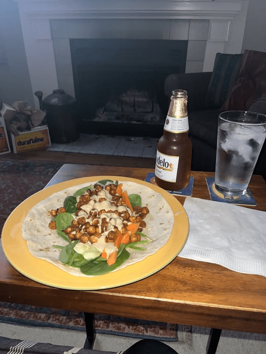 The full title is Spiced Chickpea Wraps with Tahini dressing. When I first made this, I was so impressed at how much it tasted like a falafel sandwich, which I LOVE, so it fast became a favorite. It’s pretty simple, and I really need to shout out to Thug Kitchen, where this recipe comes from. I also like the way the author writes, making cooking fun and simple and profane! You begin with cooking the chickpeas till they begin to pop like popcorn, then you cook down a liquid blend of soy, maple syrup and lemon juice before adding a spice blend including garlic powder, paprika, cumin, salt, pepper and peri peri. To serve it, you steam a large tortilla, and lay down a bed of fresh spinach, matchstick carrots and cucumber on top of a spread of tahini dressing Spoon the chickpeas on top of the vegetables and add another dollop of tahini dressing and you are off the delicious races! To make tahini dressing, you add tahini to lemon juice, olive oil, water, soy sauce and dash of rice wine vinegar. A couple cloves of finely chopped garlic and a little salt, pepper and peri peri go a long way. Also, you play with the amount of liquid to get the consistency, taste and texture right! Wrap it up and go to town! It’s definitely one of our favorite meals!