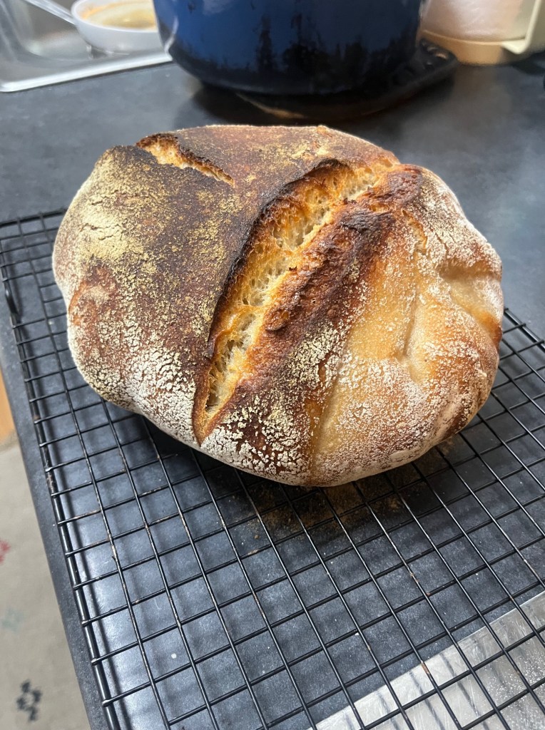In the morning, I put the Dutch Oven into the oven uncovered and turned the heat up to 525 and left it there for about 2 hours so it would be very hot when I put the loaf in. When the time came to put the loaf in, I took it out of the fridge and flipped it out onto a piece of parchment paper that I had cut in anticipation. I scored the loaf when looked perfect, and immediately took hold of the parchment and dropped it into the steaming hot dutch oven and covered it immediately, the into the oven it went with the temp at 500. After 20 minutes, I took the cover off and left it to bake. at 20 minutes I checked the color and the temperature (internal temp of 112 degrees) and decided to take it out. Onto the wire rack it went for an hour of cooling.