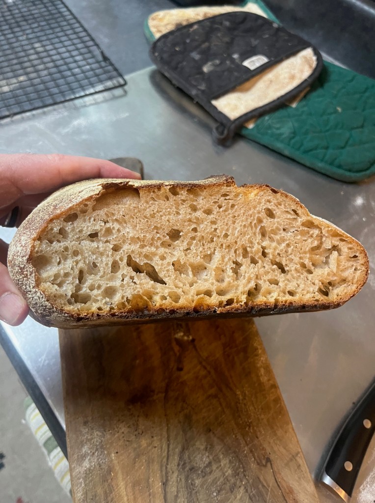 When it cooled, I cut a slice to taste it and check the crumb. During the proofing process, I made several folds to see if I could trap air in the dough, and low and behold, it looks perfect, and tastes like a perfect sourdough loaf! The crumb is open and its close to perfect! Just a few little refinements next bake to include a shorter proofing, slightly shorter in the fridge too, and to be comically gentle when I shape the next loaf!
