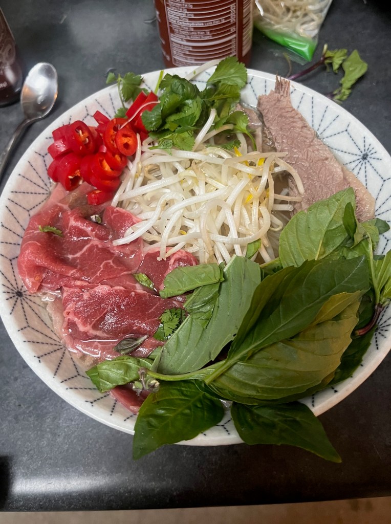 To serve you have to get the rice sticks (noodles) softened and ready, which we just about got right, and you prepare the sides. In this case, bean sprouts, cilantro, korean peppers, and the thinly sliced meats (including some of the brisket). Then, of course, you need hoisin sauce, siracha and garlic chili to make the dish sing. It’s a truly great soup.