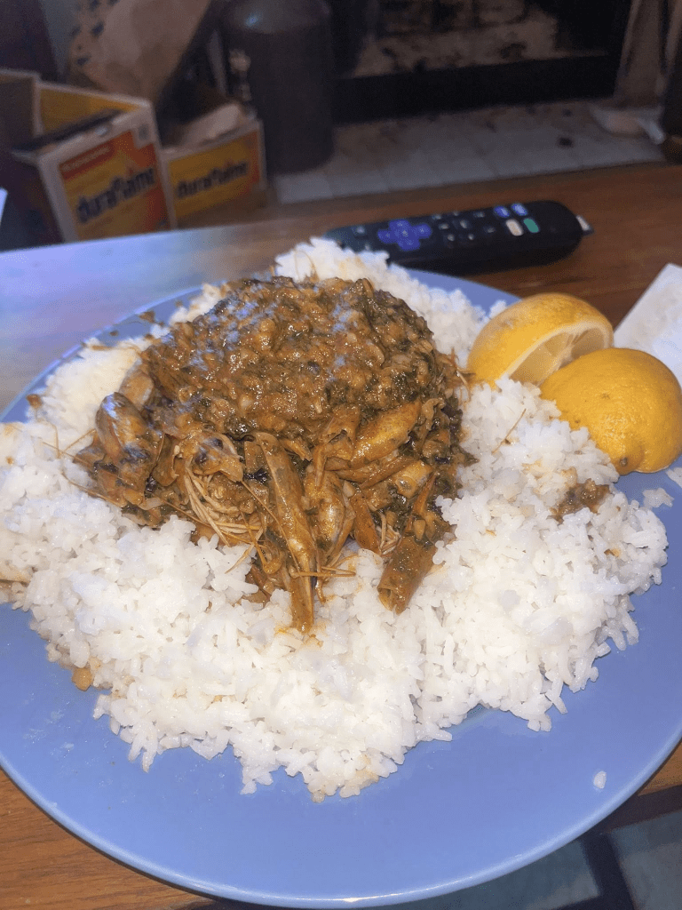 To cook it, ideally, I prefer to cook it over an open flame on the BBQ, but we do not have access to one at our apartment, so I cook them on the stovetop. I use a good size brasier and melt some butter, with olive oil, fresh peri peri powder, and some fresh garlic. When the garlic is softened, I add the prawns, I keep the temperature high and make sure to turn each one over so that they get cooked through, I add any marinade that is left, add a couple hits of angasturabitters, and squeeze a lemon over them to finish. Dish them up over the rice, pour the sauce over the shrimp and go to town. Have ice cold beer available.