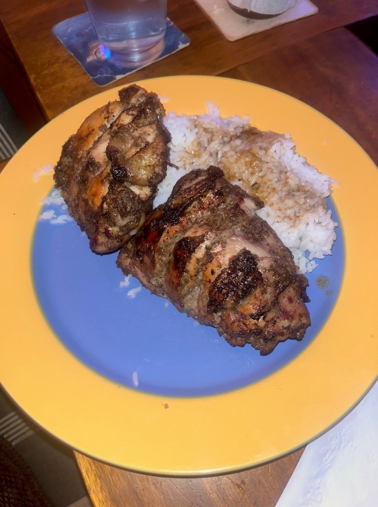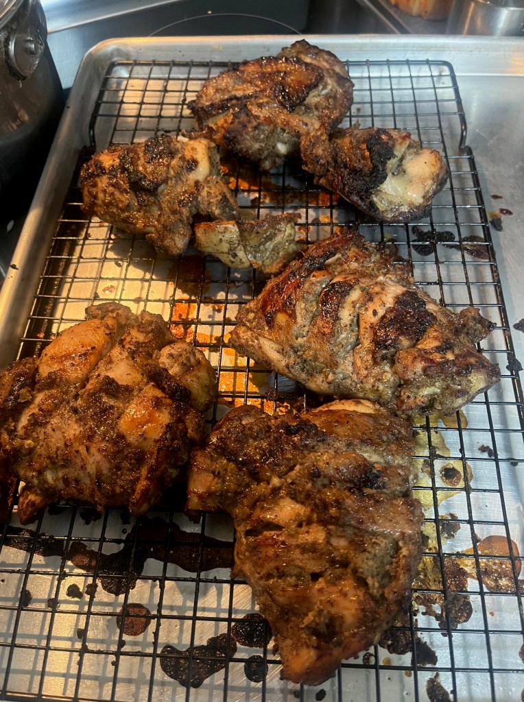 Blend everything into a thick paste. Slash bone in chicken, we used thighs, and massage the spice into the chicken. The outer limit for the marinade is 3 days, but one day will suffice. To prepare for cooking, I used a 12 inch pan, and carefully wiped the bulk of the marinade off the chicken, leaving a thin layer. I let it rest out of the fridge for about 30 minutes before baking to allow it to come to temperature and tighten up a bit. I baked it for about 40 minutes at 375 before putting the chicken on a grid and painting it with the finishing glaze of hot honey, lime juice and a pi9nch of freshly ground allspice, then caramelized the chicken under the broiler, turning and basting it often for the next few minutes till it began to turn.