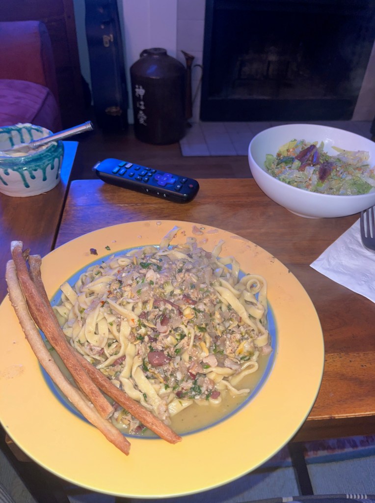 I served the pasta with fresh made breadsticks and aCeasar Salad along with the rest of the bottle of wine. It was a masterful meal! Heathere said, “That is the best version of this dish you have ever made!”