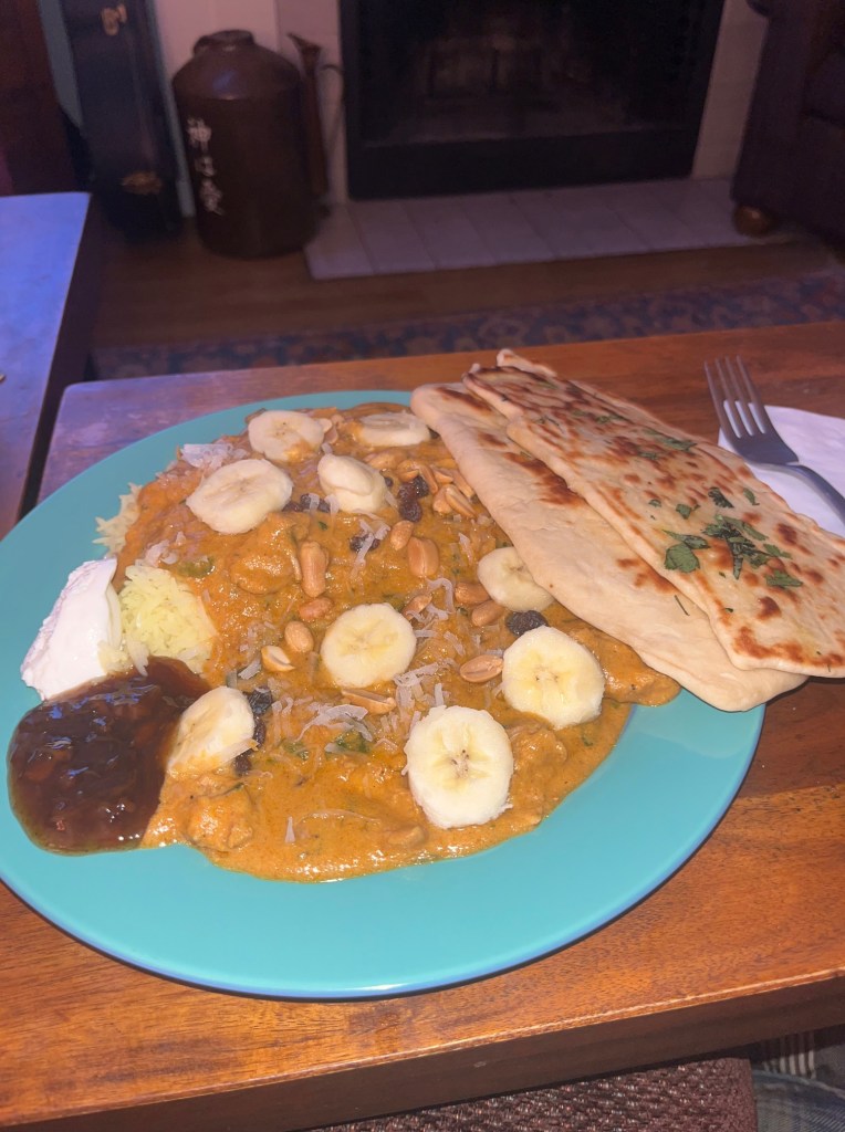 We made our rice with saffron and I also made garlic naan. It is such a great dish. A fair bit of work, but great.