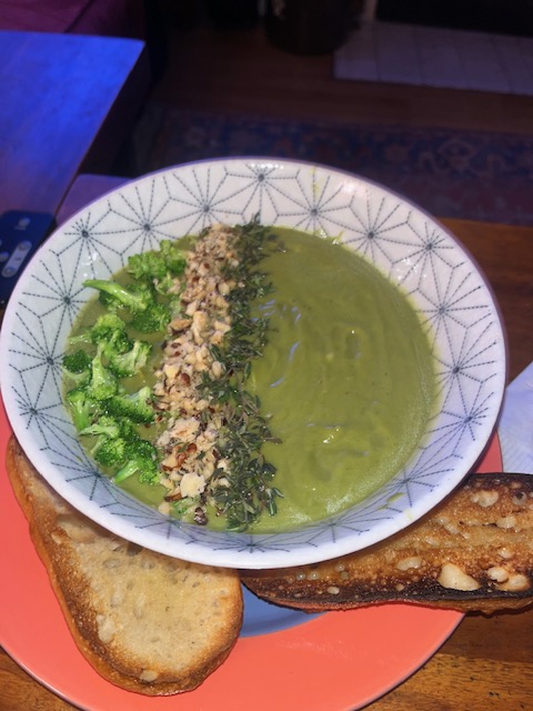 Serve it with the broccoli, hazelnuts and trhyme leaves as illustrated. We also make garlic bread out of toasted bagettes that I rub a clove of garlic over.