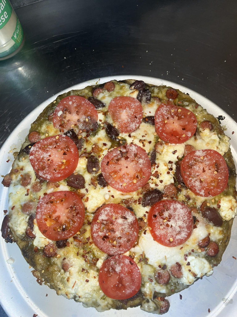 When we enjoy a steak, I often make this incredible “green sauce” which is a form of a refined sauce made from a chimichurri. I start with whatever green vegetables are fresh. I add garlic, ginger and shallots, and I blend them all in a blender with some chicken bone stock. Then I further smooth it out by running the whole blended mix through the cuisinart and finally through a chinois. After that, I reduce it, adding fish sauce, soy sauce, lime juice, red wine vinegar, hot hoeny, sugar and maple syrup and in the end, finish it with butter before serving it as a side to the steak and baked potato. Its a smooth, hot spicy absolutely layered and delicious sauce that amplifies the steak. When there is leftover sauce, you cannot throw it out. It has to be used. What better base for a pizza? Then, we had left over Korean spicy sausage, goat cheese, fresh mozzarella, calamita olives, and fresh tomatoes. It seems like a good blend.