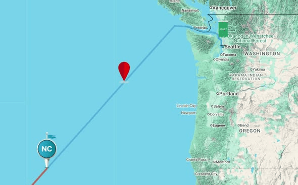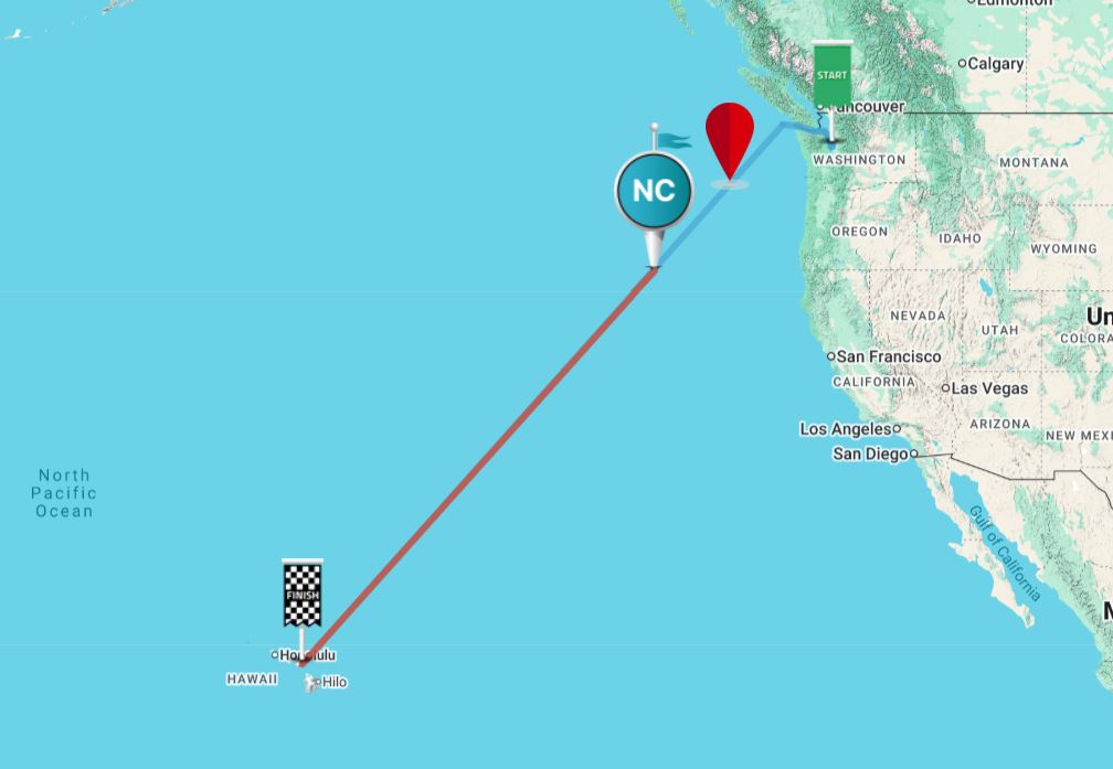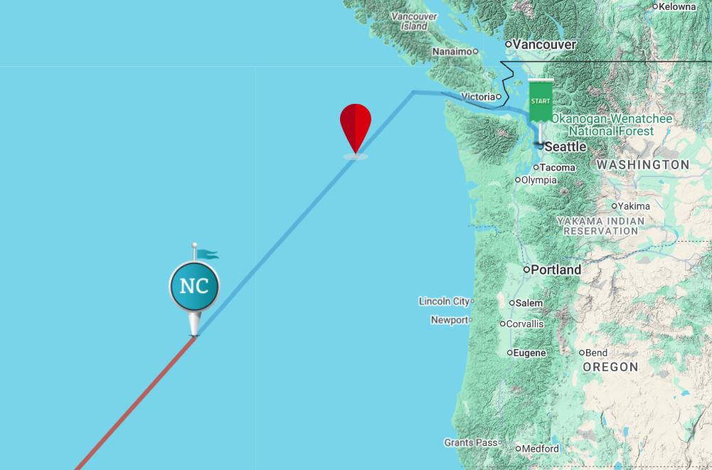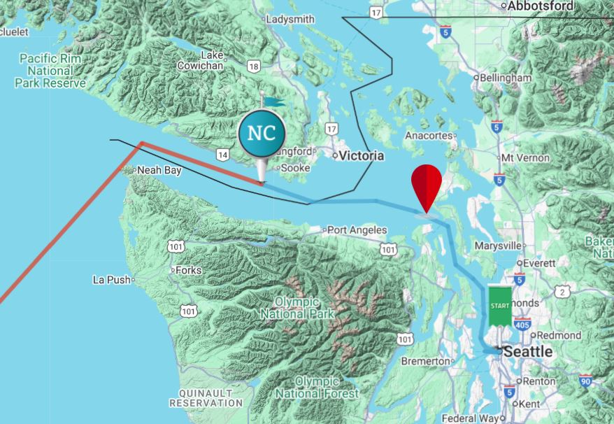 As you can see, I rowed up through the Sound and into the Straights of Juan de Fuca on my way out to the ocean. The tag NC is my location, while the red tear drop is my anticipated position based on the time I allocated to the row.