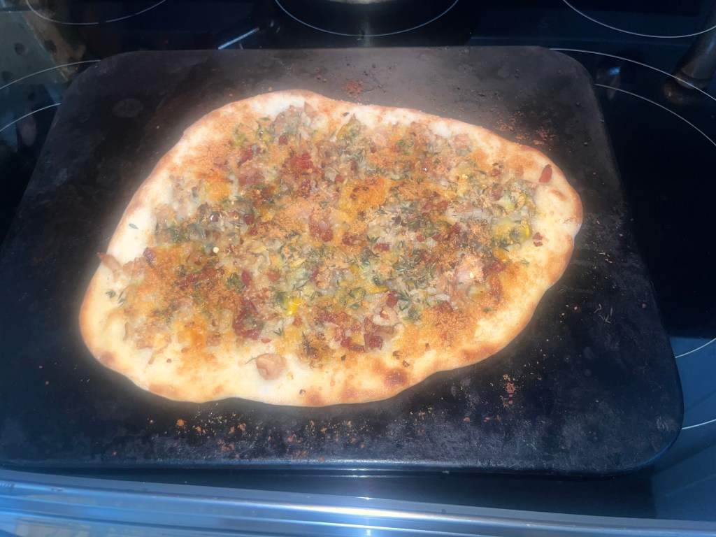 We are getting better at baking pizza in our oven. We recently got a new oven that goes up to 550 degrees Fahrenheit, and I have experimented with where in the oven the pizza stone sits. In our oven, it works best if its in the middle on the lower of the middle rungs. We have also found that two other things matter. One is that we do not overload the pizza with ingredients. Having a “less is more” frame seems important in this exploration. The second thing that matters, now that I have perfected the pizza dough, it the cook. Remember, we heat the oven up with the stone in the oven so it is already hot, and I prep the pizza on parchment paper making it easy to slide it onto and pick up off the stone with our cookie sheet. Next, the time for the perfect bake is different for each pizza, but at no point is it less than 7 minutes. So, starting at 7 minutes we check the bake and add more time, in either one minute or 30 second increments based on the color of the edges. To put it in a nutshell, we are getting really good at this!