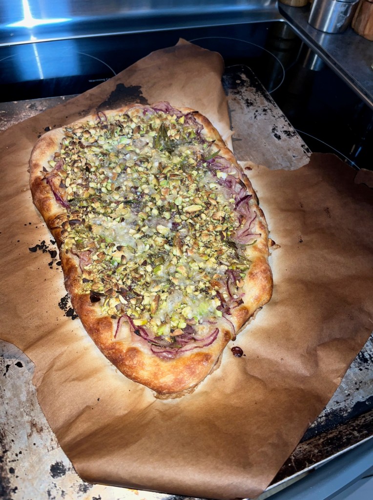 What makes this pizza so yummy is that it is actually a very simple pie. It has Parmesan, Thinly sliced red onions, fresh rosemary, and it is finished with chopped pistachio nuts that are introduced part way through the cook. It is a stunning pizza and I am sure we will make it again and again.