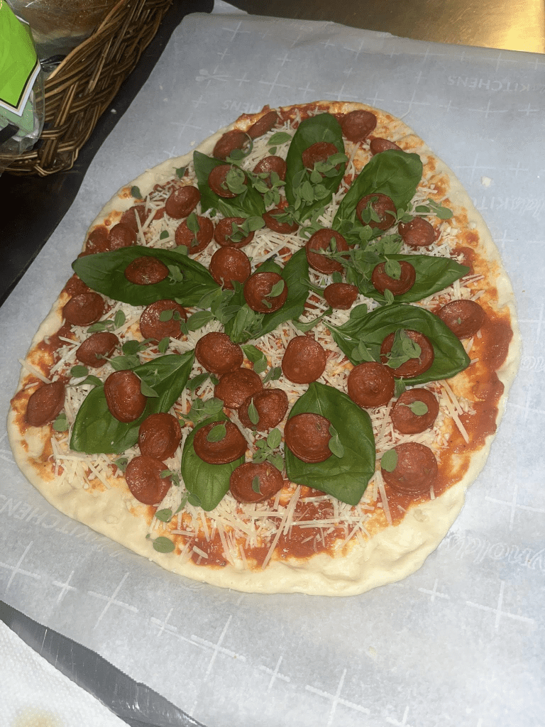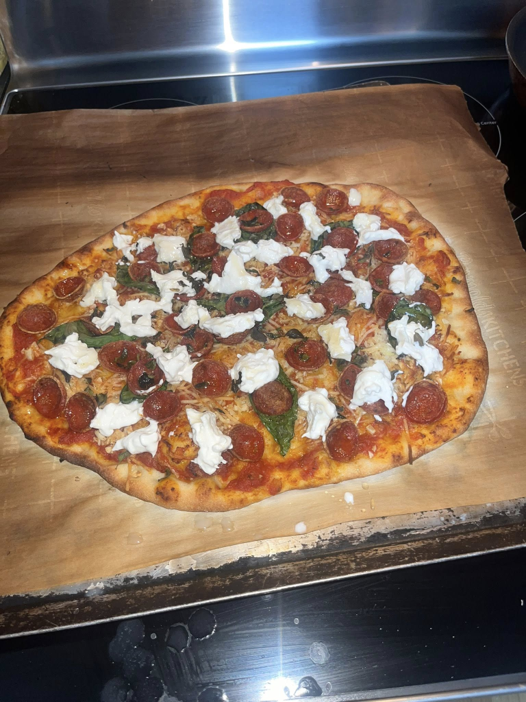 Last night, we made the “Jersey Girl”, this one is inspired by their ingredient list including Burrata, romano, tomato sauce, garlic, oregano, extra crispy pepperoni, basil, hot honey. It’s a real winner. Really good.