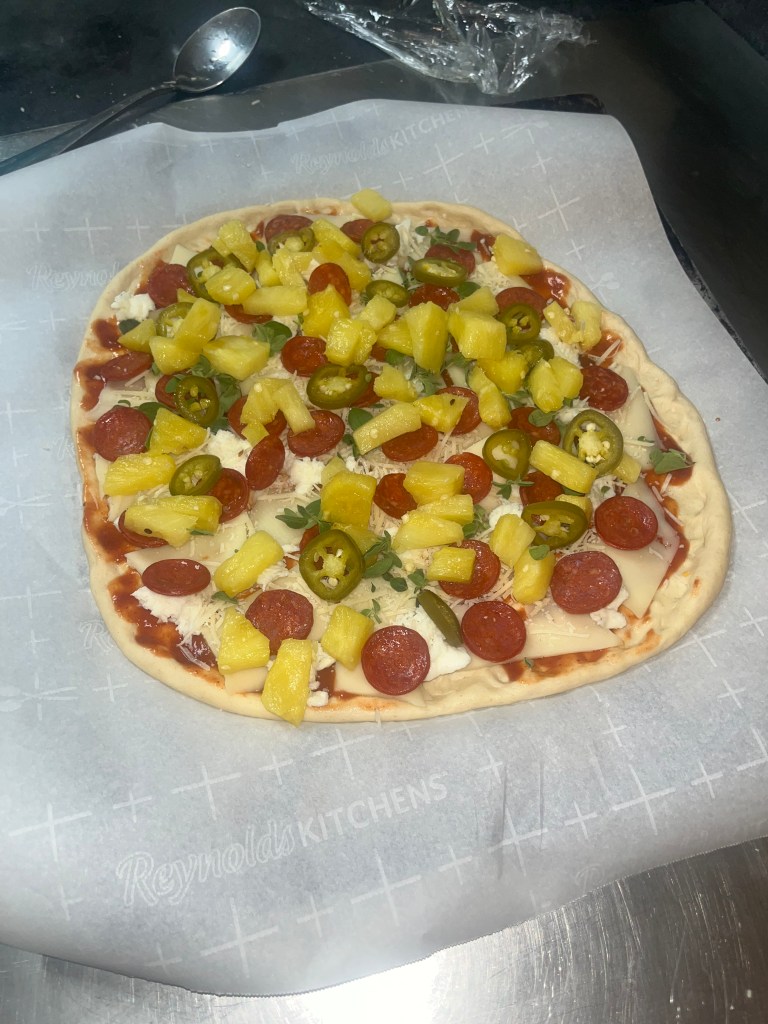 Next up we went to the menu from PDX of Portland, a passion project of Chef Miriam, a NYC raised chef with good ideas. The pizza we chose to make was her Yum Yum Hawaiian which we modified by using a spicy tomato sauce, and peperoni (which we had in stock) rather than salami. We also used the jalapeno’s from the pineapple pickle and finished with hot honey. It was so delicious that we will make it again, but this time with Salami instead of peperoni. The pizza includes fresh mozzarella, romano, fontina, tomato sauce, oregano, basil, Genoa Salami, and 2-week pickled jalapeño pineapple